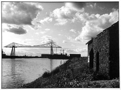 This view combines several elements that together symbolise much of Teesside. The most important element is the Transporter Bridge, - almost a century old, and the only surviving bridge of its kind in the country. The Transporter is used on letterheads, in advertisements, and on posters as a powerful representational symbol of the area. The second element is the River Tees itself, once the lifeblood of the area. The building on the right, and the surrounding grassy area, is part of a now derelict quayside. Only 50 years ago, this was a busy port with steamships tied up alongside. All that has now-gone, with only decaying ruins to remind one. The third element, but only distant, are the cooling towers of the chemical industry. |