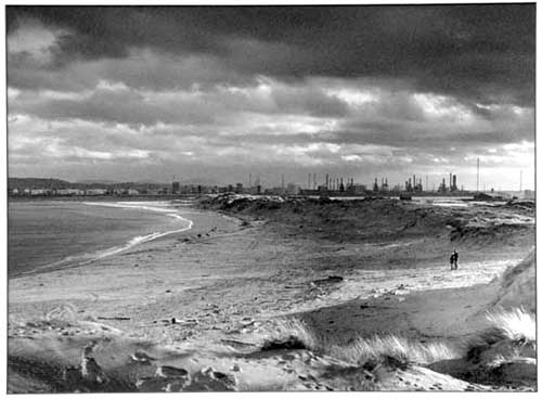 One April evening, a massive storm was brewing over Teesside. Very heavy clouds were building up, but this scene was taken just before the last rays of light had been extinguished by these clouds. Most satisfyingly, one of the last rays of light illuminated the couple surveying the beach before beating a hasty retreat. The skyline shows the huge chemical industry associated with Teesside, - refineries, petrochemical complexes, and oil storage depots. Just to the right, but out of sight, is the Hartlepool Nuclear Power Station. |