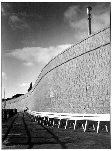 Part of the original fortifications of the Old Town, this wall has a most majestic sweep to it. The Council have provided a bench that runs the length of the wall. This bench is well used on summer evenings by those enjoying the last warm rays of the sun, whilst overlooking the view of the small harbour by the Old Town itself. Even here, however, the dockside cranes are not too far away. |